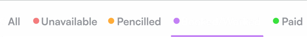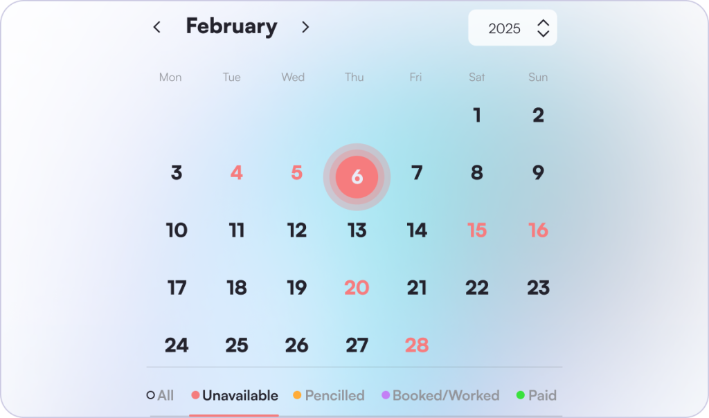 Stay in control of your schedule with clear colour-coded days for availability, bookings, and payments, which can be filtered using the bottom bar so you can quickly focus on what matters most.